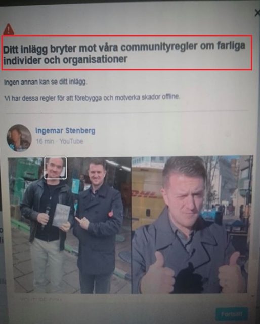 Samhällsnytts redaktion har mottagit flera meddelanden från läsare som på Facebook har delat vårt senaste videoreportage om medborgarjournalisten Tommy Robinson. Läsarna får delningarna borttagna och sina konton blockerade.