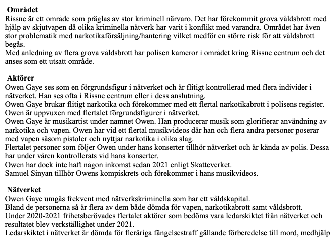Det framgår av polisutredningen att Owen Gaye har kopplingar till ett kriminellt nätverk i Rissne. Enligt polisen bedöms nätverket ha ett högt våldskapital och gänget har negativ påverkan på lokalsamhället.