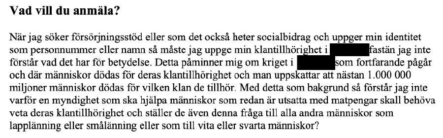 Han ifrågasätter varför socialtjänsten behöver klanuppgiften, och undrar om de även frågar människor som söker bidrag om de är lapplänningar eller smålänningar, vita eller svarta.