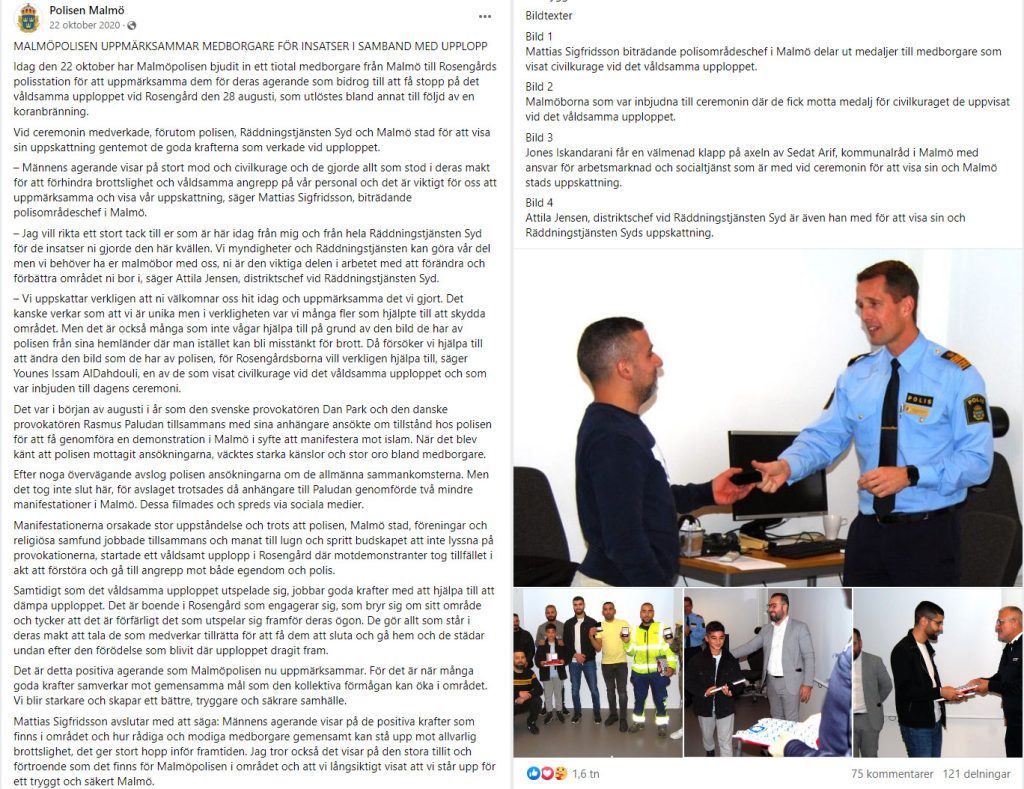 Den skriftliga motiveringen, som Malmöpolisen publicerade på sin Facebooksida, var medaljörernas ”agerande som bidrog till att få stopp på det våldsamma upploppet vid Rosengård den 28 augusti” det året.