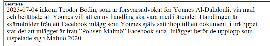 22-årige Malmöbon Younes Al-Dahdouli och ytterligare fem andra åtalas för grovt sabotage mot blåljusverksamhet sedan de kastat sten mot såväl poliser som mot politikern Rasmus Paludan. Al-Dahdouli har tidigare fått medalj av polisen för ”stort mod och civilkurage” i samband med muslimska oroligheter när ”den danske provokatören Rasmus Paludan” velat bränna koranen.