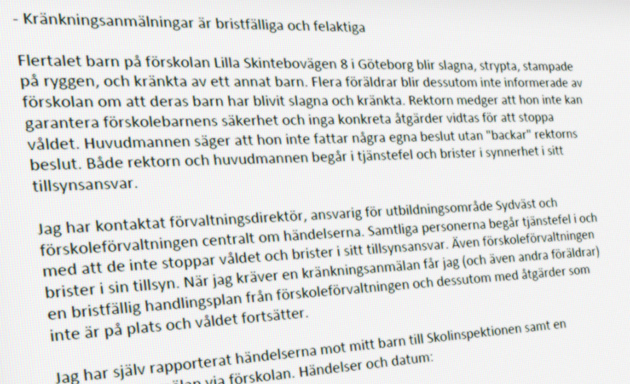 Under onsdagen skickar en mamma till ett av de drabbade barnen in en anmälan till Justitieombudsmannen riktad mot Göteborgs stads förskoleförvaltning och den aktuella förskolan. Av den framgår att hennes barn utsatts för våld, bland annat genom att ha blivit slagen i ansiktet med ett objekt.