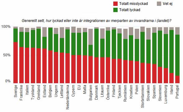 Sverige det mest motsägelsefulla landet Sverige sticker i undersökningen ut som det mest motsägelsefulla landet i EU. Samtidigt som fler här än i något annat EU-land säger sig se den utomeuropeiska invandringen som en möjlighet, är svenskarna också det folk som mer än något annat anser att integrationen inte fungerar.