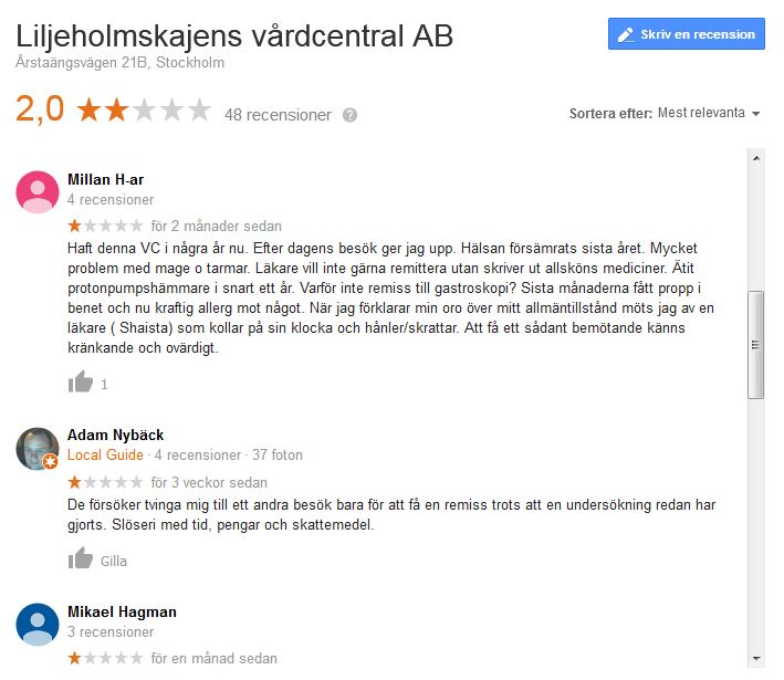 Det kan noteras att vårdcentralen har ovanligt dåliga omdömen på Google – bara två stjärnor av fem möjliga. En överväldigande majoritet av de 48 recensionerna ger bara en stjärna: