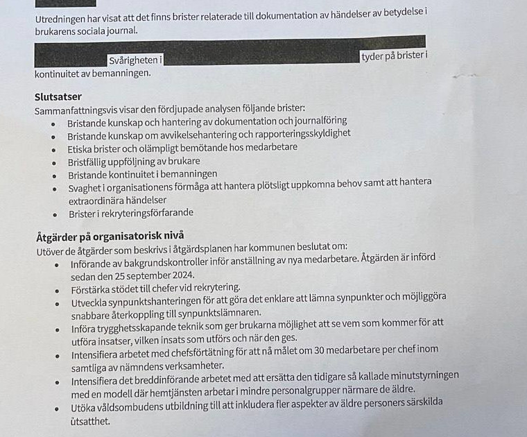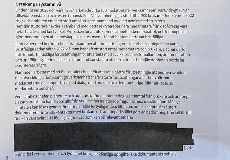 I utredningen står det att ”förutsättningarna för arbetsledningen varit bristfälliga sedan våren 2022” och att det inte funnits ”tillräckliga förutsättningar för att arbeta med avvikelser, missförhållanden, dokumentation och uppföljning”.