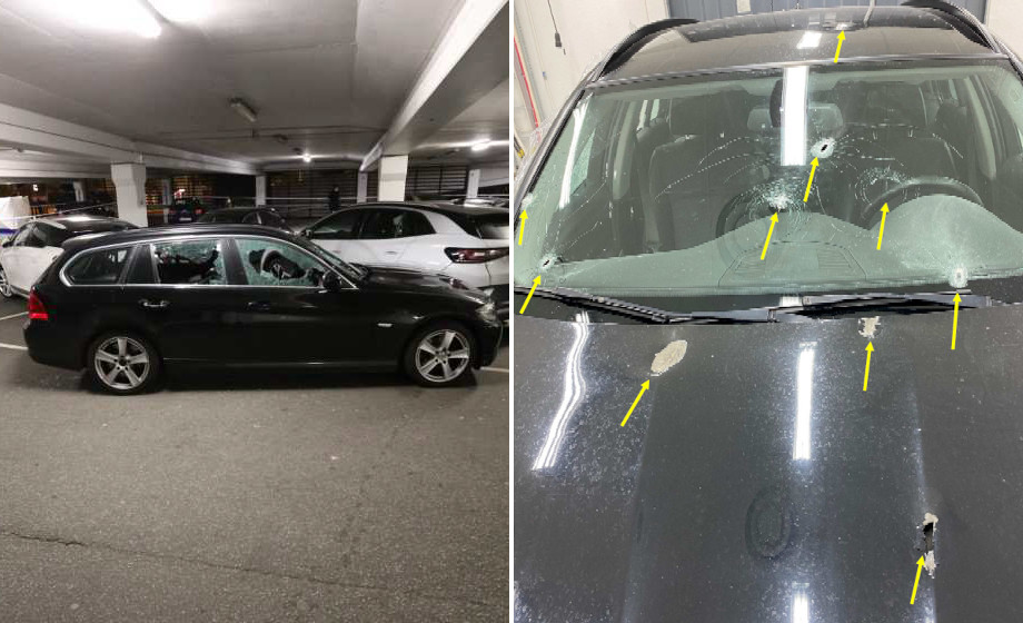 Medan mannen sitter och väntar på sin fru dyker det upp två män på en moped. Den man som sitter som passagerare på mopeden skjuter med ett flertal skott in genom bilen.
