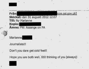 Nedan syns ett exempel av påtryckning från brittiska åklagarmyndigheten riktad mot den feministiska överåklagaren Marianne Ny. I mejlet går det att läsa att hon inte ska få kalla fötter på grund av frågor från journalister.