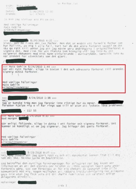 I mejlkorrespondens som Melzer har tagit fram går det att läsa att kriminalinspektör Mats Gehlin beordrar en förfalskning av ett uttalande gjort av ett påstått offer.