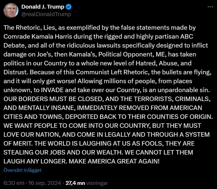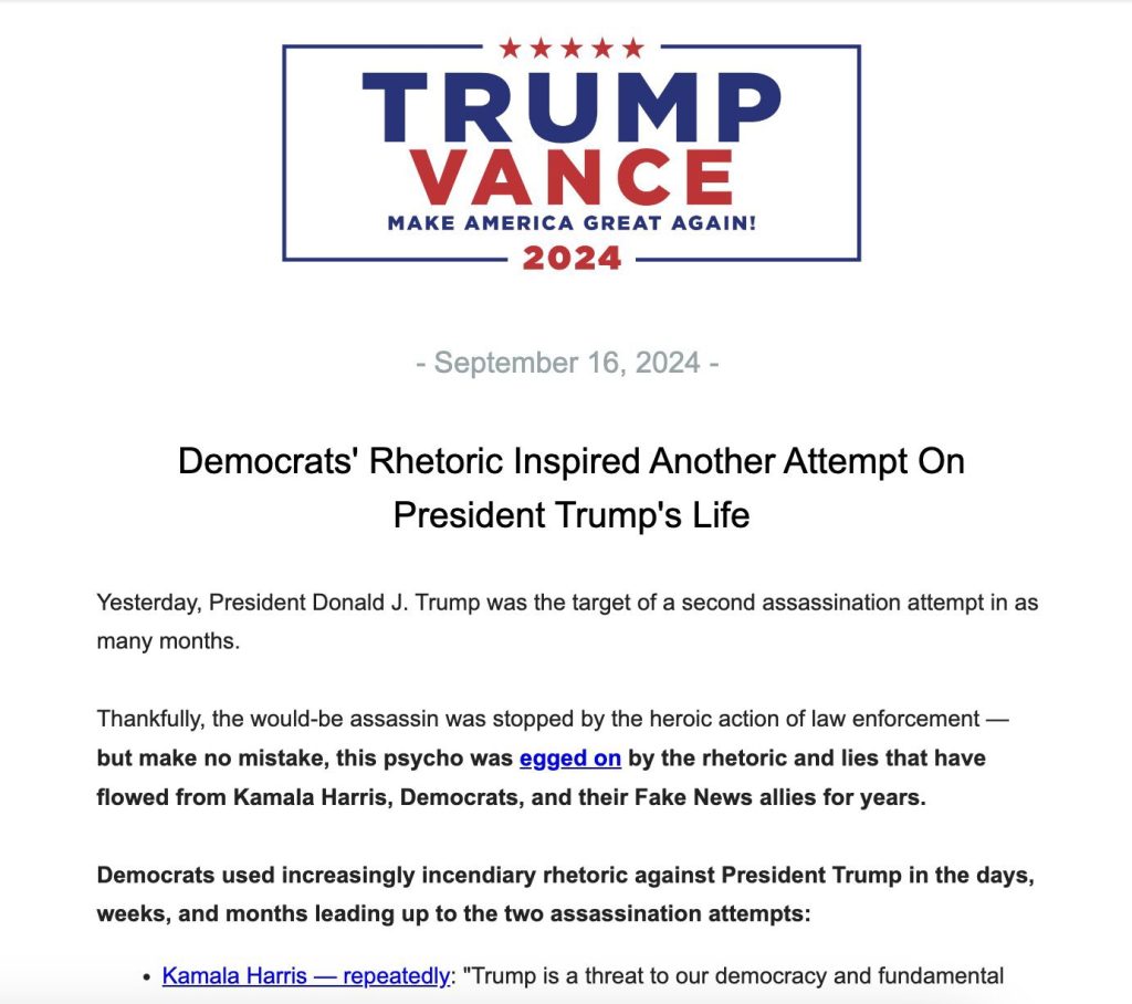 På kort tid har den republikanske presidentkandidaten Donald Trump utsatts för två mordförsök varav ett bara var några millimeter från att lyckas. Ett av skälen som pekas ut som orsak till våldet är retoriken bland journalister och politiker där Trump ständigt utmålas som ”rasist”, ”fascist” och ”ett hot mot demokratin”.