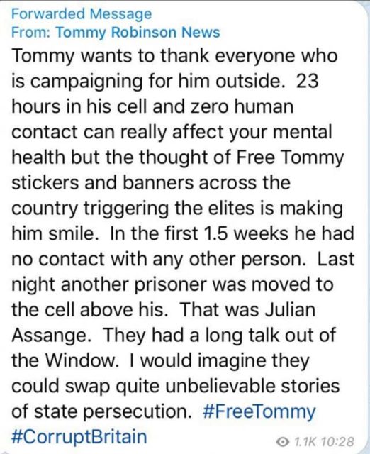 Granne med Assange Under den första tiden i fängelset hölls Robinson helt isolerad. Nu har han enligt uppgift fått en granne i cellen ovanför som han kan prata med – Julian Assange. Två förkämpar för det fria ordet, som nu alltså är fängslade på samma plats. Enligt meddelandet höll de en lång konversation genom cellernas fönster, då Assange flyttats in.