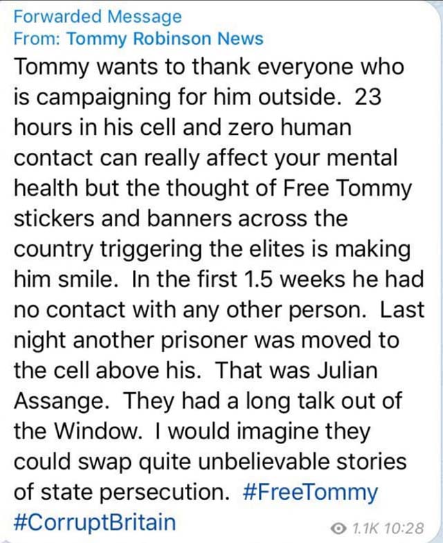 Robinson, som sitter isolerad 23 av dygnets timmar, skriver att avsaknaden av mänsklig kontakt verkligen kan påverka ens psyke men att han håller modet uppe. Av meddelandet framgår att han roas av tanken på hur klistermärken och banderoller med budskapet ”Free Tommy” retar upp Storbritanniens elit.