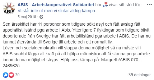 ”Fått uppehållstillstånd pga arbete i ABIS” På organisationens Facebookkonto stoltserar man med att asylsökare som fått avslag och vistats illegalt i landet har fått uppehållstillstånd genom arbete i ABIS. Det framgår även att migranter som tidigare har blivit utvisade från Sverige har lyckats återvända med asylaktivisternas hjälp.