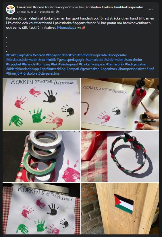 På en förskola i Stockholm har man ansett det vara en bra idé att blanda in barnen i kriget mellan Israel och terrorgruppen Hamas. Detta görs genom att barnen bland annat fått göra armband i den palestinska flaggans färger.