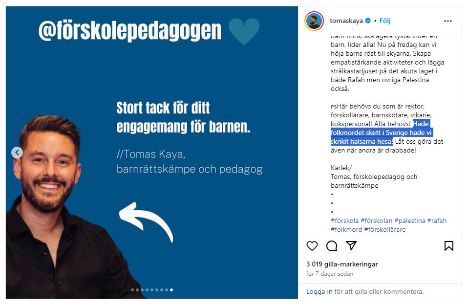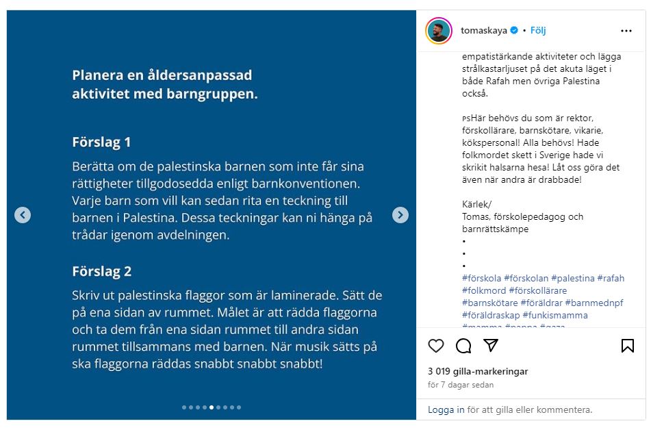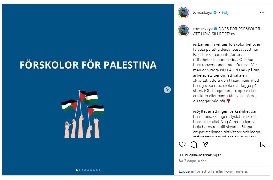 För några dagar sen gick förskolepedagogen Tomas Kaya ut och uppmanade landets förskolor att ”höja sin röst” och påtvinga svenska barn den pågående konflikten i Mellanöstern: