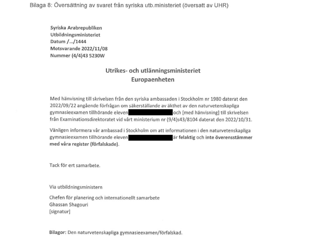 I december 2022 hör det syriska utbildningsministeriet av sig med besked om att de betyg 26-åringen skickat in till UHR är förfalskade.