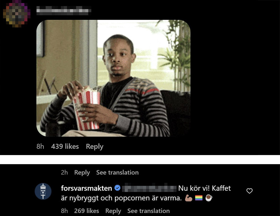 ”Nu kör vi! Kaffet är nybryggt och popcornen är varma”, skriver Försvarsmakten som svar till en meme föreställandes en man som äter popcorn.