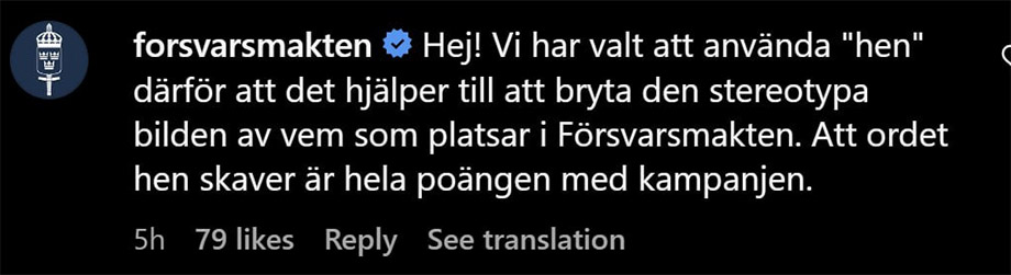 ”Att ordet hen skaver är hela poängen med kampanjen”, skriver Försvarsmakten som kommentar på Instagram.