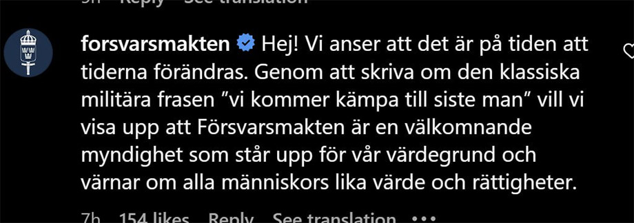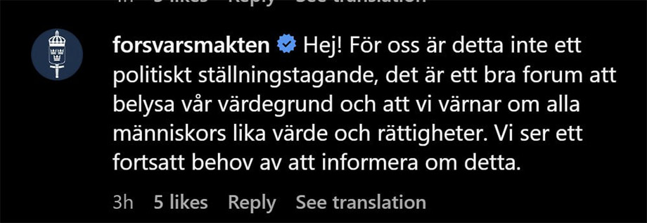 Vissa som läser kommentarsfältet på Instagram tycks roas av de indignerade kommentarerna. Något som även Försvarsmaktens kommunikatörer tycks göra.