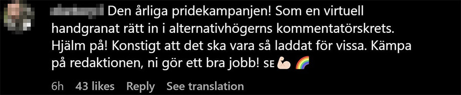 ”Den årliga pridekampanjen! Som en virtuell handgranat rätt in i alternativhögerns kommentatörskrets. Hjälm på! Konstigt att det ska vara så laddat för vissa. Kämpa på redaktionen, ni gör ett bra jobb!” skriver han som kommentar på Instagram.
