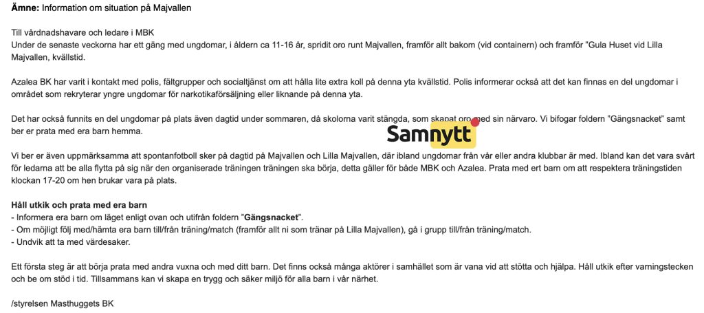 Det är i ett mejlutskick den här veckan som fotbollsklubbarna Azalea BK och Masthuggets BK varnar föräldrarna för att gängkriminella tar över området kring träningsanläggning och hemmaplanen Majvallen i de södra delarna av stadsdelen Majorna.