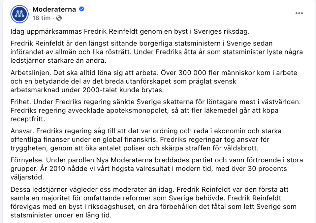 I ett inlägg på Facebook har Moderaterna kommenterat det hela med att Reinfeldts politik ”vägleder oss moderater än idag”.