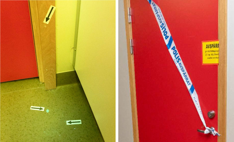 Flickan kan peka ut ett omklädningsrum på skolan som den 23-årige fritidsledaren tagit med henne till. Där i ett hörn på golvet och väggen ses någon form av fläckar. Mamman misstänker att 23-åringen onanerat och därefter ejakulerat på golvet.