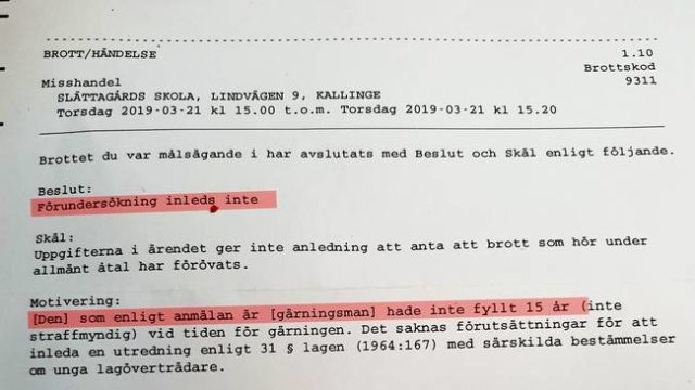 En vecka senare mottog föräldrarna beskedet att polisen inte inleder någon förundersökning eftersom de misstänkta gärningsmännen inte har fyllt 15 år. Fadern är nu skeptisk till rättsväsendet.