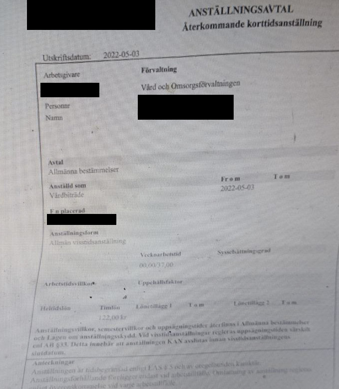 Vi får en avfotograferad kopia på anställningskontraktet, och tipsaren menar att det vore ”en stor social tjänst” om Samnytt avslöjar att en gängkriminell anställts på ett serviceboende.
