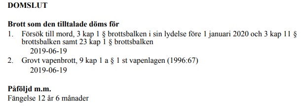 På fredagen meddelade Uppsala tingsrätt att Ali döms för försök till mord och grovt vapenbrott. Det samlade straffvärdet anges till 14 men domstolen mildrar straffet till 12 år och sex månader i fängelse. Efter avdragen tredjedel enligt praxis blir den reella fängelsepåföljden 8 år och 3 månader.