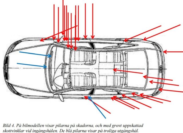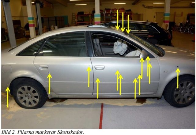 Ali har avlossat 27 skott från en Kalasjnikov och medhjälparen som körde BMW:n har skjutit åtta skott från en pistol. Bilen hade 30 kulhål varav nio skott gått in i offrets överkropp. Offret överlevde trots detta mirakulöst.