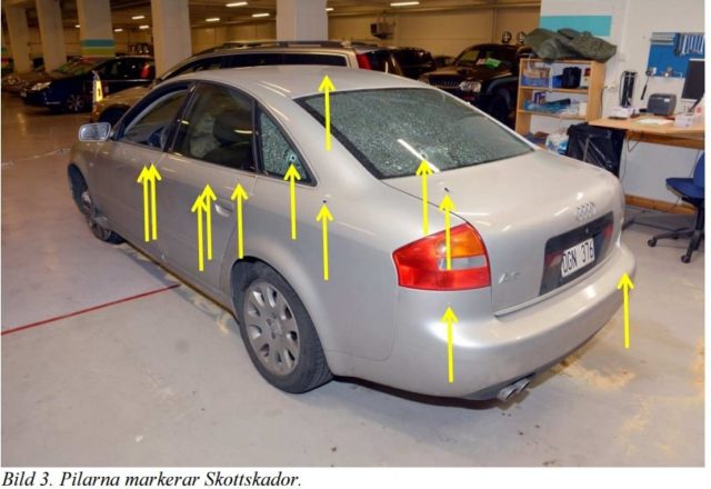 Vid den tekniska undersökningen av Audin som brottsoffret körde påträffades en skyddsväst. En titt i belastningsregistret visar att brottsoffret tidigare är dömd för bland annat grovt vapenbrott, hot mot tjänsteman, våld mot tjänsteman, olaga hot, sexuellt ofredande, misshandel, flera narkotikabrott, brott mot knivlagen och butiksstöld.