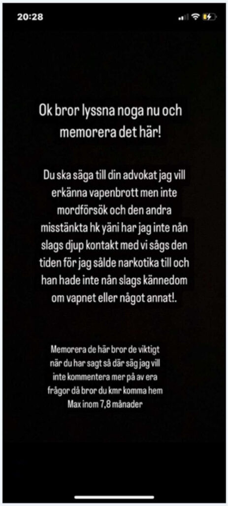 En av pojkarna får, efter att han omhändertagits, skriftliga instruktioner skickade till sig om vad han ska säga till sin advokat och till polisen när han förhörs. Bland annat uppmanas han att inte erkänna mordförsök.