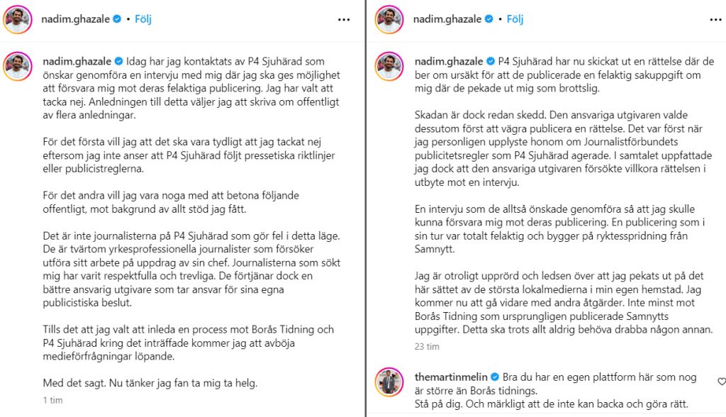 Nadim Ghazale skriver i ett sociala medier-inlägg att Sveriges radios rapportering om honom ”bygger på ryktesspridning från Samnytt”. Det är ett påstående som David Svanberg tillbakavisar.