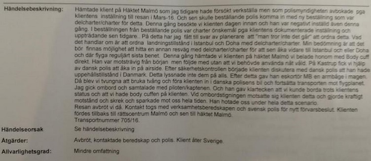 ”Jag gick ombord och samtalade med piloten/kaptenen. Och han gav klartecken att vi kunde borda trots klientens status och att vi hade body cuffen på klienten. Vid ombordsstigning motsatte sig klienten detta och gjorde kraftigt motstånd och skrek och sparkade mot oss hela tiden. Han hotade oss under hela detta scenario. Resan avbröt vi då. Klienten fördes tillbaka till rättscentrum i Malmö och sen till häktet Malmö. Allvarlighetsgrad: mindre omfattning.”