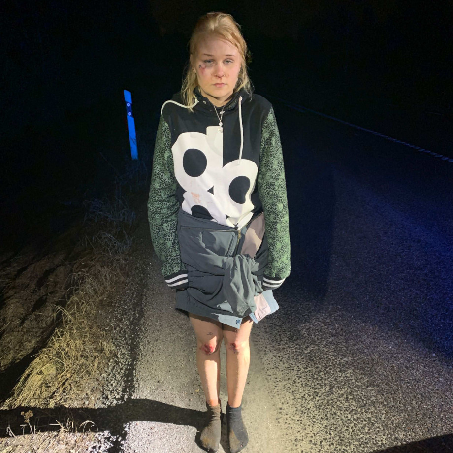 Det kommer in fler larm om en hög smäll i Björkhaga i en annan del av Örebro. Flera polispatruller åker till bostadsområdet i utkanten av staden. Gåendes längs vägen påträffas där en ung byxlös blond kvinna. Hon är blåslagen och har blodiga knän.