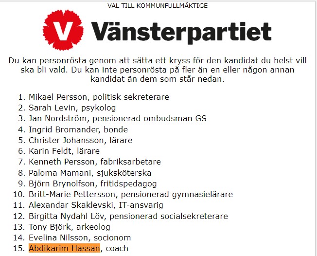 Abdikarim Hassan – Kristianstad En tidigare representant för Socialdemokraterna som nu ställer upp för Vänsterpartiet i Kristianstads kommun transporterade enligt åklagarkammaren i Kristianstad ett halvt kilo cannabis i en skolväska – påföljden blev i detta fall sex månader.