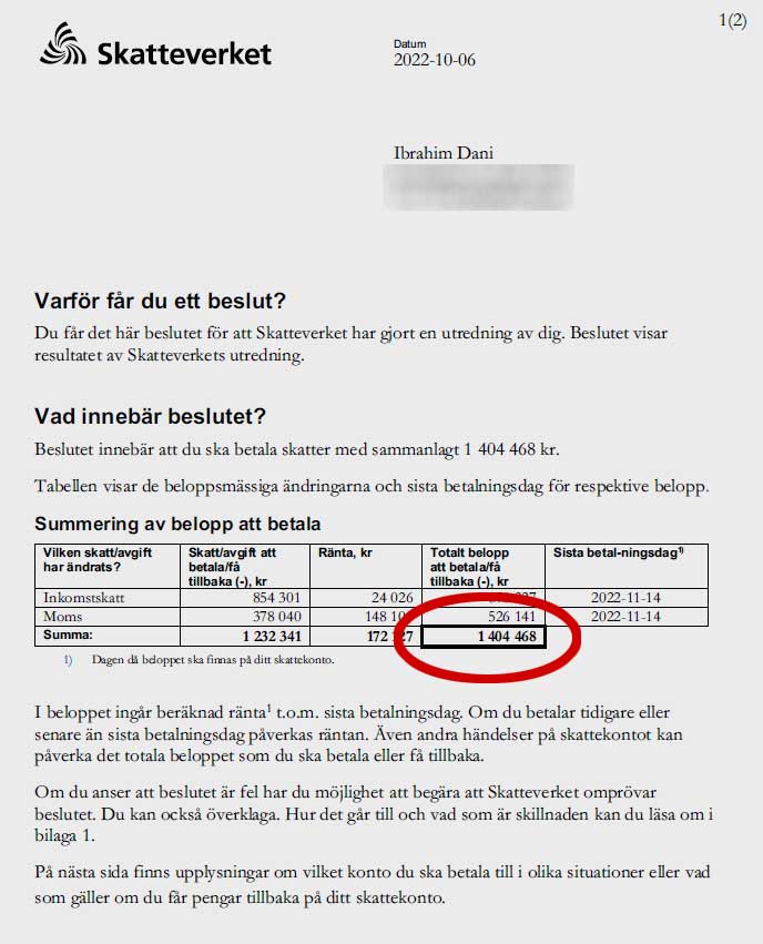 Inte heller sätter man någon tilltro till Danis alternativa förklaring, att han inte har en aning om vem som satt in miljonbelopp på hans bankkonton. Utöver brottsutredningen beslutar Skattemyndigheten att han ska betala in närmare 1,5 miljoner kronor i undanhållen skatt.