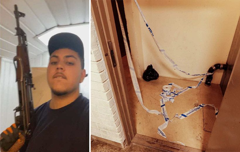 Benjamin Flores Tilleria poserar med vapen och det källarutrymme där flickan hölls inlåst. Foto: Polisens förundersökning