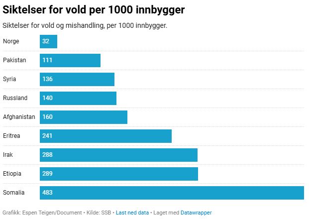 För varje 1 000 somaliska män i åldern 15-24 i huvudstaden Oslo har 483 stycken åtalats för våld eller misshandel. Det var en av slutsatserna då norska motsvarigheten till Statistiska centralbyrån, Statistisk sentralbyrå, publicerade ny brottsstatistik i december.