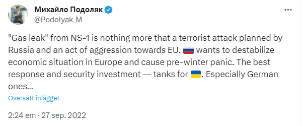Zelenskyjs rådgivare Mychajlo Podoljak uppmanade förra året Tyskland att skicka stridsvagnar till Ukraina som ”svar” på Nordstream-attentatet. Faksimil