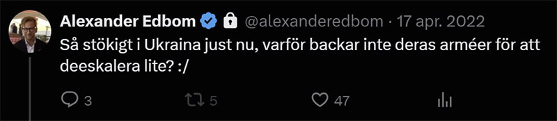 Bland annat hans inlägg om att Ukrainas arméer borde backa för att ”deeskalera lite”, en sarkastisk referens till polisens strategi under korankravallerna.