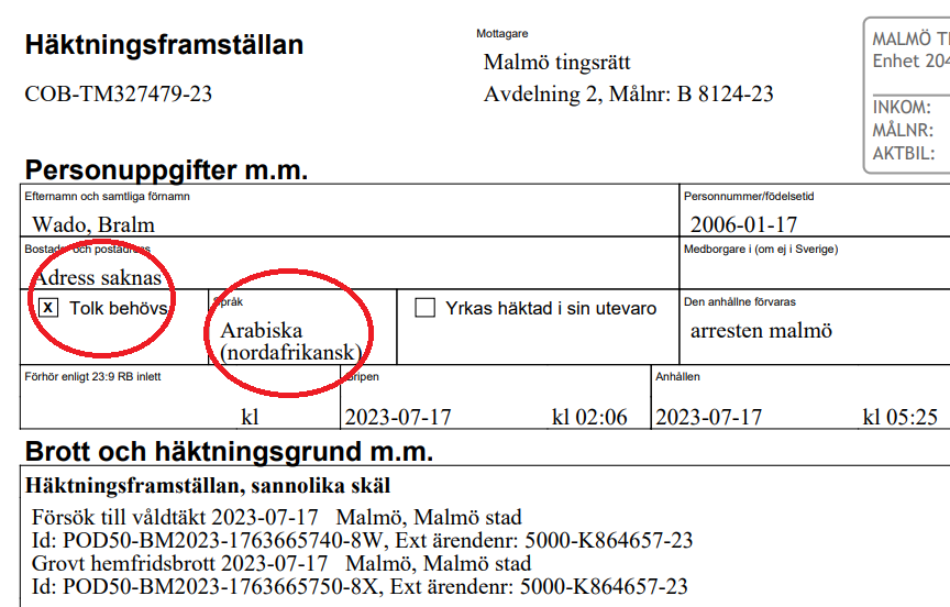 Det framgår av handlingar från Malmö tingsrätt att misstänkt gärningsman saknar adress i Sverige och har även tolkbehov på ”arabiska (nordafrikansk)”. Vidare har han inget personnummer eller samordingsnummer.