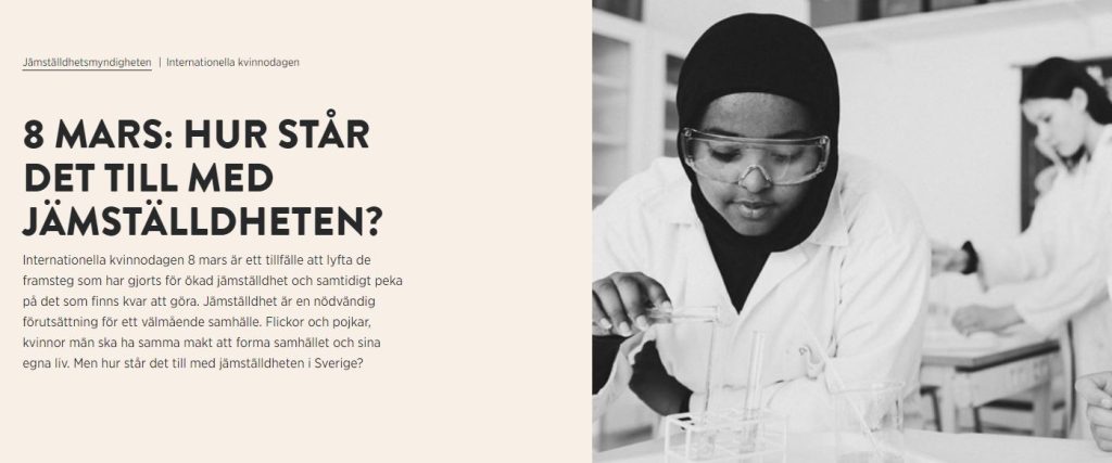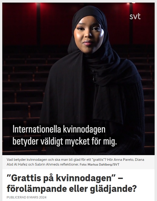 Den 8 mars var internationella kvinnodagen som uppmärksammades av olika myndigheter, bland andra Jämställdhetsmyndigheten. Sättet man gjorde detta på ifrågasätts dock och kritiker pekar på det olämpliga i att inkludera en beslöjad kvinna – det kanske främsta uttrycket för kvinnoförtryck – i sammanhanget.