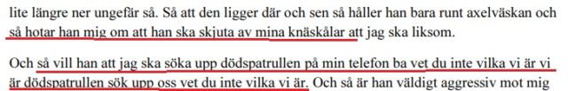 I polisförhör berättar de rånade pojkarna att de i hetsigt och aggressivt tonläge hotats med att bli skjutna. Bland annat skulle deras knäskålar skjutas sönder.