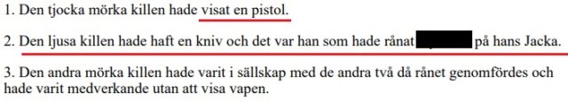 De tre målsägande berättar samstämmigt att det var Einár som var drivande i rånet, höll i kniven som sattes mot brottsoffrets mage med orden, ”ta av dig jackan”. Rånet genomfördes tillsammans med två bekanta med invandrarbakgrund boende i Enskededalen söder om Stockholm.