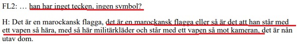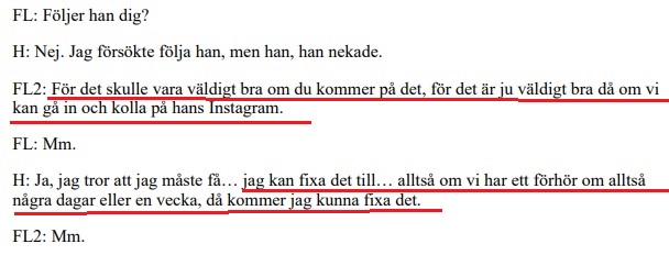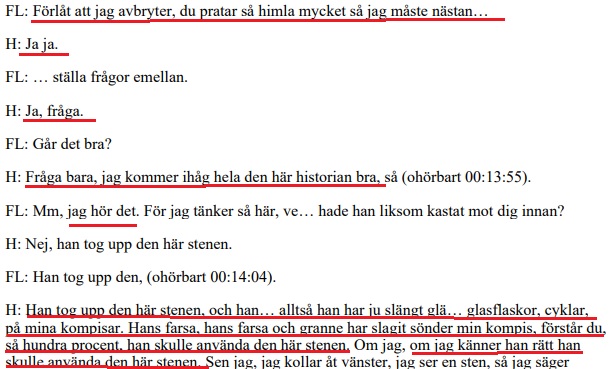 I själva verket får polisens förhörsledare (FL) avbryta, därför att Einár är för ivrig med att berätta: ”Förlåt att jag avbryter, du pratar så himla mycket” säger polismannen när Einár (H) i forcerad takt berättar detaljerat för myndigheten om händelser.