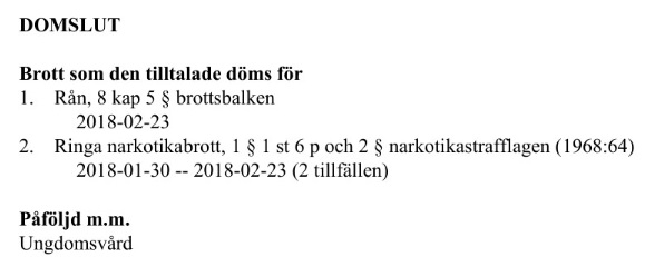 Det var vid lunchtid den 23 augusti 2018 som polisen mottog larm om att ett sällskap med tre pojkar hade rånats med hjälp av kniv och pistol på bland annat en vinterjacka av lyxmärket Parajumpers med ett nypris omkring 10 000 kronor. Polisen utredde händelsen som grovt rån men varken kniven eller pistolen kunde påträffas i samband med att polisen grep rånarna.