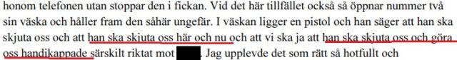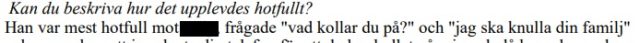 Vidare uttrycktes hot när brottsoffren tittade på gärningspersonerna. Man skulle våldta brottsoffrets familj: