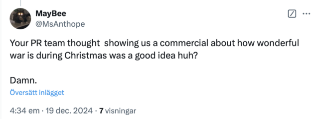 En annan person har framfört kritik mot att Nato lagt fokus på ett krigsbudskap i juletider.