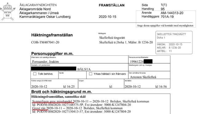 Torsdagen den 15 oktober meddelade Skellefteå tingsrätt att man beviljar kammaråklagare Oskar Lundbergs begäran om häktning. Åtal ska väckas senast den 29 oktober.